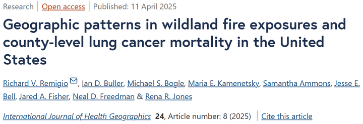 I co-authored an article in the International Journal of Health Geographics entitled “Geographic patterns in wildland fire exposures and county-level lung cancer mortality in the United States” led by Dr. Richard Remigio.