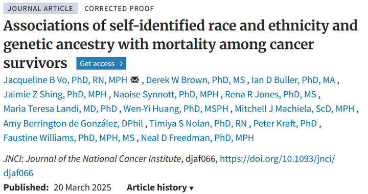 I co-authored an article in the Journal of the National Cancer Institute entitled “Associations of self-identified race and ethnicity and genetic ancestry with mortality among cancer survivors” led by Dr. Jacqueline Vo and Dr. Derek Brown.