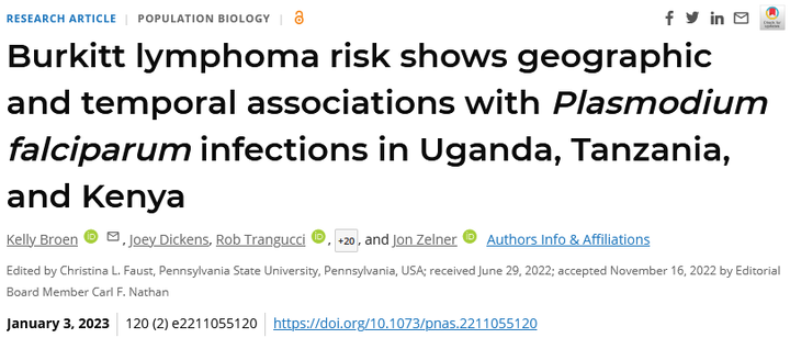 I co-authored an article in the Proceedings of the National Academy of Sciences entitled “Burkitt lymphoma risk shows geographic and temporal associations with Plasmodium falciparum infections in Uganda, Tanzania, and Kenya” led by Kelly Broen and Dr. Sam Mbulaiteye.