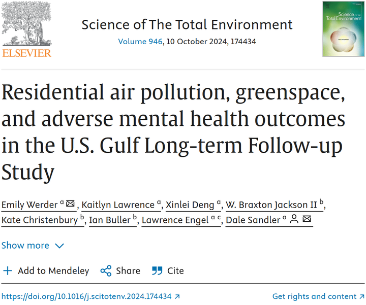 I co-authored an article in Science of the Total Environment entitled “Residential air pollution, greenspace, and adverse mental health outcomes in the U.S. Gulf Long-term Follow-up Study” led by Dr. Emily Werder.